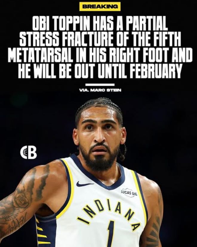 对了,步行者今天在赛前又迎来噩梦,此前因为右脚应力反应的奥比-托平已经确诊为应力性骨折要缺席3个月。